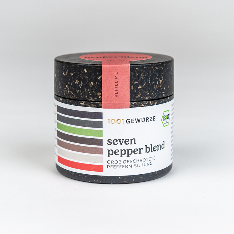 Inside: sechs starke Pfeffersorten - und einer, der zwar keiner ist, aber seit jeher auf den Spitznamen "Nelkenpfeffer" hört. Unser Seven Pepper Blend zeigt, was Pfeffer drauf hat und freut sich auf vielfältigen Einsatz: als Grill- und Steakpfeffer, zu edlem Käse und über alle Speisen, denen noch ein kleiner Kick fehlt.