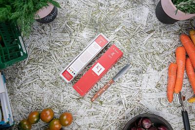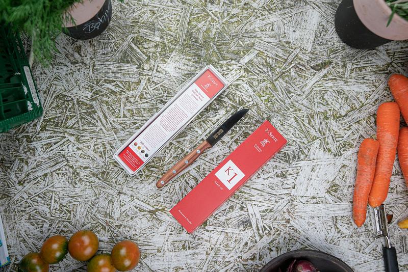 K 1 Universal-Küchenmesser aus rostfreiem Chrom-Molybdän-Vanadium- Stahl mit 0,7% Kohlenstoff, gehärtet auf 60 HRC, blaugepließtet von Hand, mit Griff aus Pflaumenholz, mit Aluminiumnieten