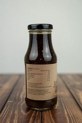Sojasauce (Sojabohnen entfettet, Salz, Fructose-Glucose-Sirup, Alkohol aus Tapioka, Hefeextrakt) 30,9%, Wasser 17%, Maissirup 21,6%, Apfelmark* 18,5%, Zucker* 8,1%, Knoblauch* 3,3%, Guarkernmehl* 0,6%, weißer Pfeffer* 0,1% (*aus kontrolliert biologischem Anbau)