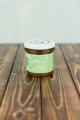 Zwiebel 33%, Zucker 33%, Apfel, Weinessig, Weißwein, konzentrierter Traubenmost, Geliermittel: Pektine, Säuerungsmittel: Citronensäure, Konservierungsstoff: Sorbinsäure, Farbstoff: Ammonium-Zuckerkulör, Antioxidationsmittel: Kaliummetabisulfit, Chili, Curry