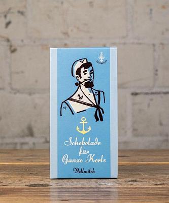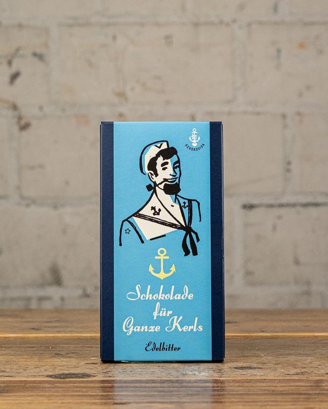 Die Tafel für die Kerls von heute: Satte Edelbitterschokolade im maritimen Look und freundlichem Lächeln vorne drauf. Nordisch Naschen in gut.
