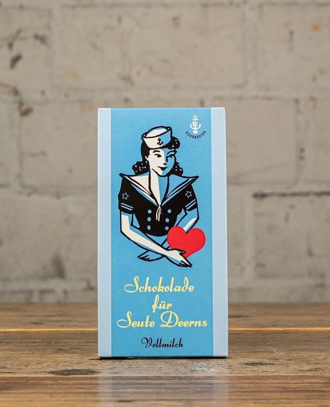Das ist Schokolade für die Frau von hier und heute. Reine Vollmilchschokolade, kein Schnickschnack, volles Karamellaroma und purer Genuss! Für die besonders Süßen Unsere Vollmilchschokolade schmeckt allen Naschkatzen, Feinschmeckern, Schokoladenfans und natürlich süßen Mädchen! Sie ist so, wie Vollmilchschokolade sein muss. Hier kommt das Beste aus der Kakaobohne zusammen und wird liebevoll von Hand verarbeitet. So entsteht eine unserer beliebtesten Schokoladen. Ohne Schmu, ohne künstliche Zusätze – und das schmeckt man! Die Auswahl bester Zutaten und eine sorgfältige Verarbeitung machen sich am Ende bezahlt: Wie das Lächeln einer süßen Dame haut uns der zarte Schmelz dieser Schokolade um. Herrliches Schokoladenaroma, eine feine Note Karamell und eine liebliche Süße, die nicht im Hals kratzt. So mögen wir unsere Deern am liebsten! Wer kann da widerstehen? Unsere Seute Deern Vollmilchschokolade ist die ideale kleine Aufmerksamkeit für die Freundin, eine süße Freude für die Mama zum Muttertag, ein liebes Gesche
